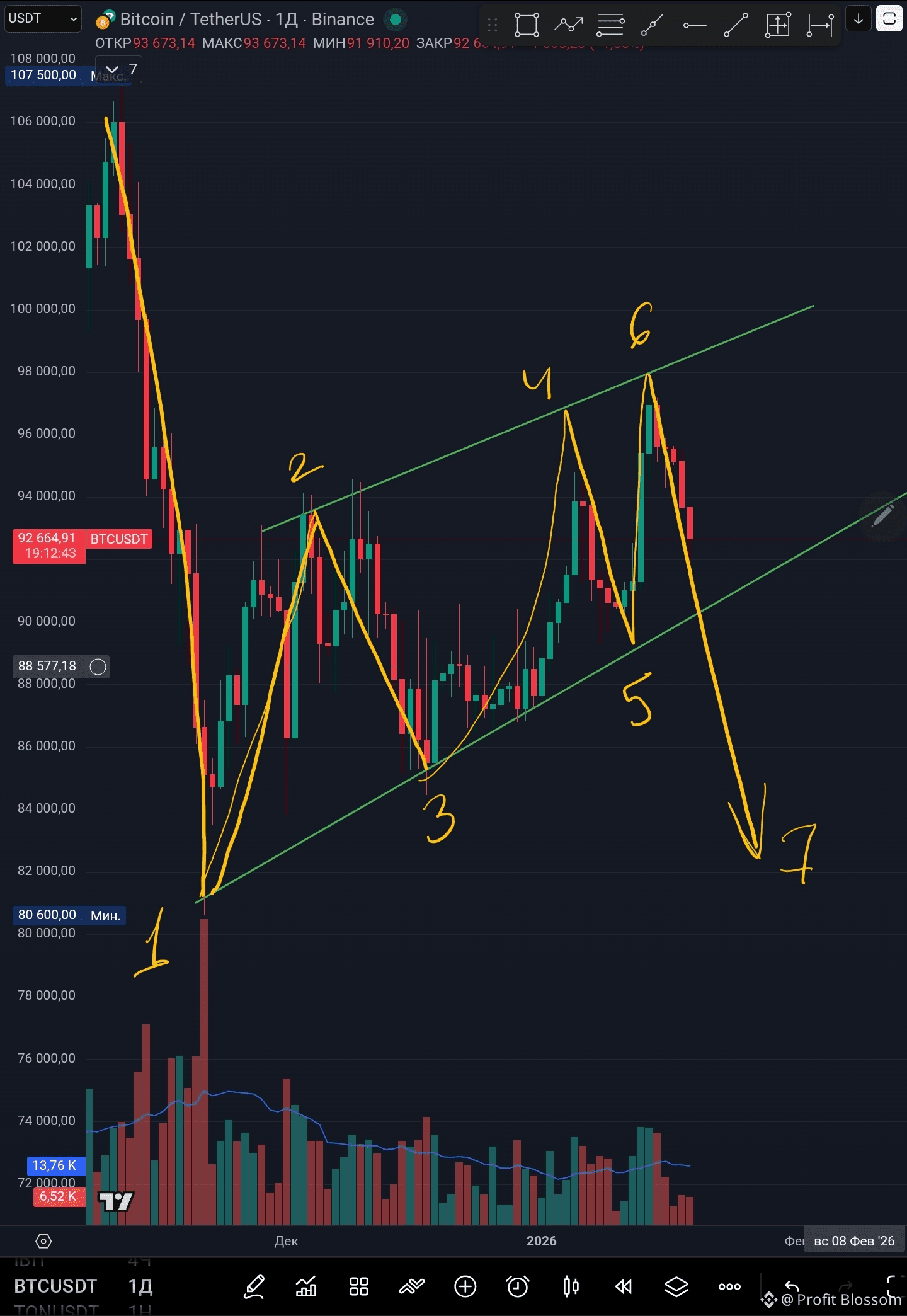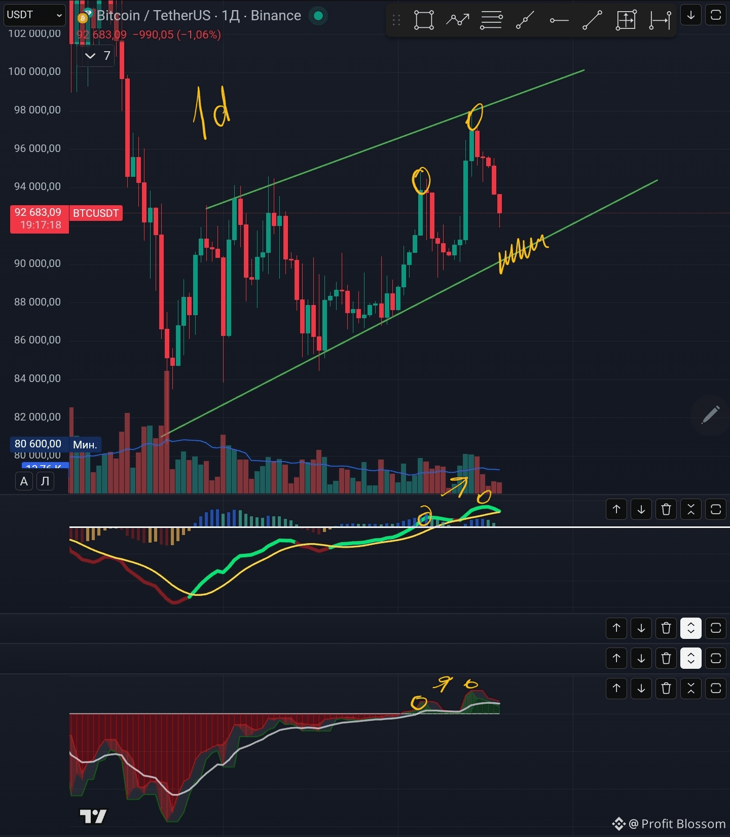 Доброе утро дорогие друзья как мы с вами предполагали цена $BTC опустилась к нижней грани восходящего клина. Индикаторы показывают, что ещё одна восходящая волна возможна.