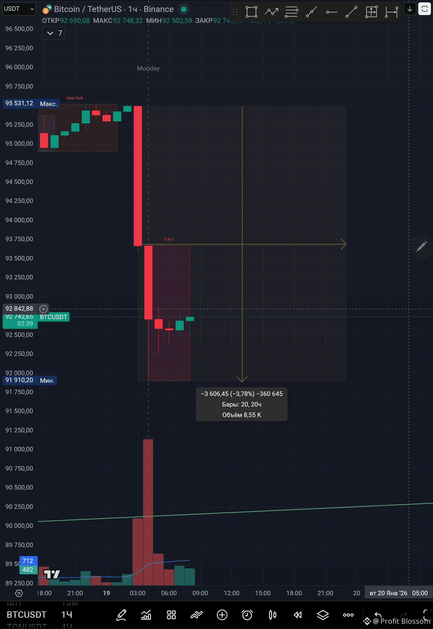 Сразу перед открытием токийской сессии произошёл слив цены, который на объёмах продолжила Азия