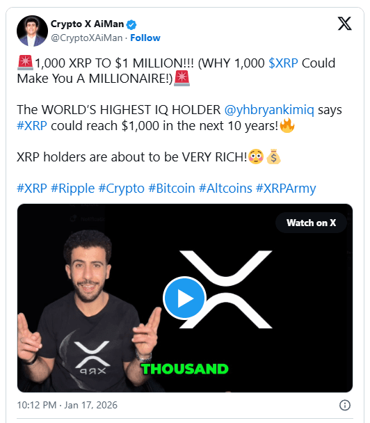 Un elemento centrale dell'argomento ha comportato la citazione di un post pubblico attribuito a Young Hoon Kim, descritto come avente un QI eccezionalmente alto. Crypto X AiMan ha dichiarato che Kim aveva suggerito che XRP potrebbe raggiungere $1.000 nel prossimo decennio, un'affermazione che il YouTuber ha usato per supportare la plausibilità della propria prospettiva a lungo termine. Ha ribadito che questa previsione esterna era allineata con un orizzonte di dieci anni piuttosto che con un'immediata impennata.