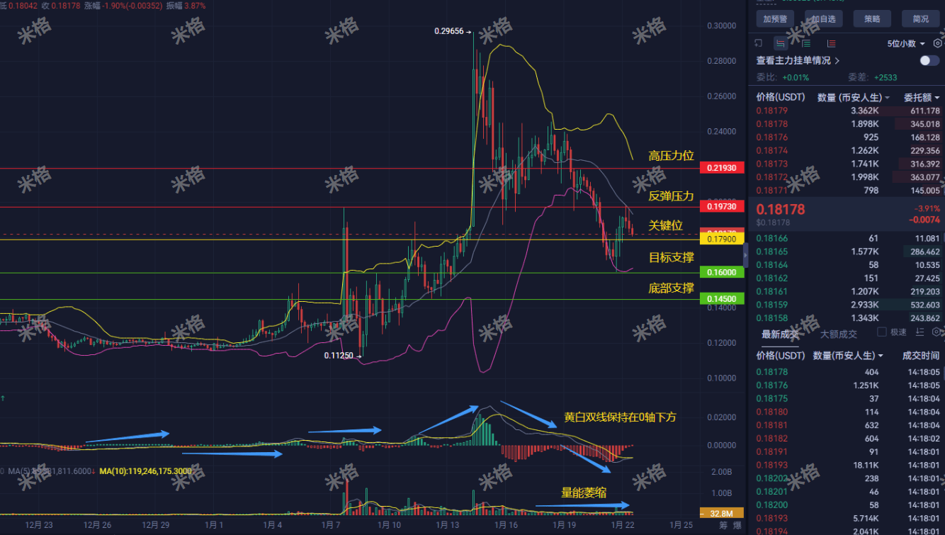 Il prezzo è schiacciato da tutte le medie mobili a breve termine, scendendo da 0.29 a 0.18, il rimbalzo non riesce nemmeno a superare 0.185, indicando che gli acquisti sono estremamente deboli.