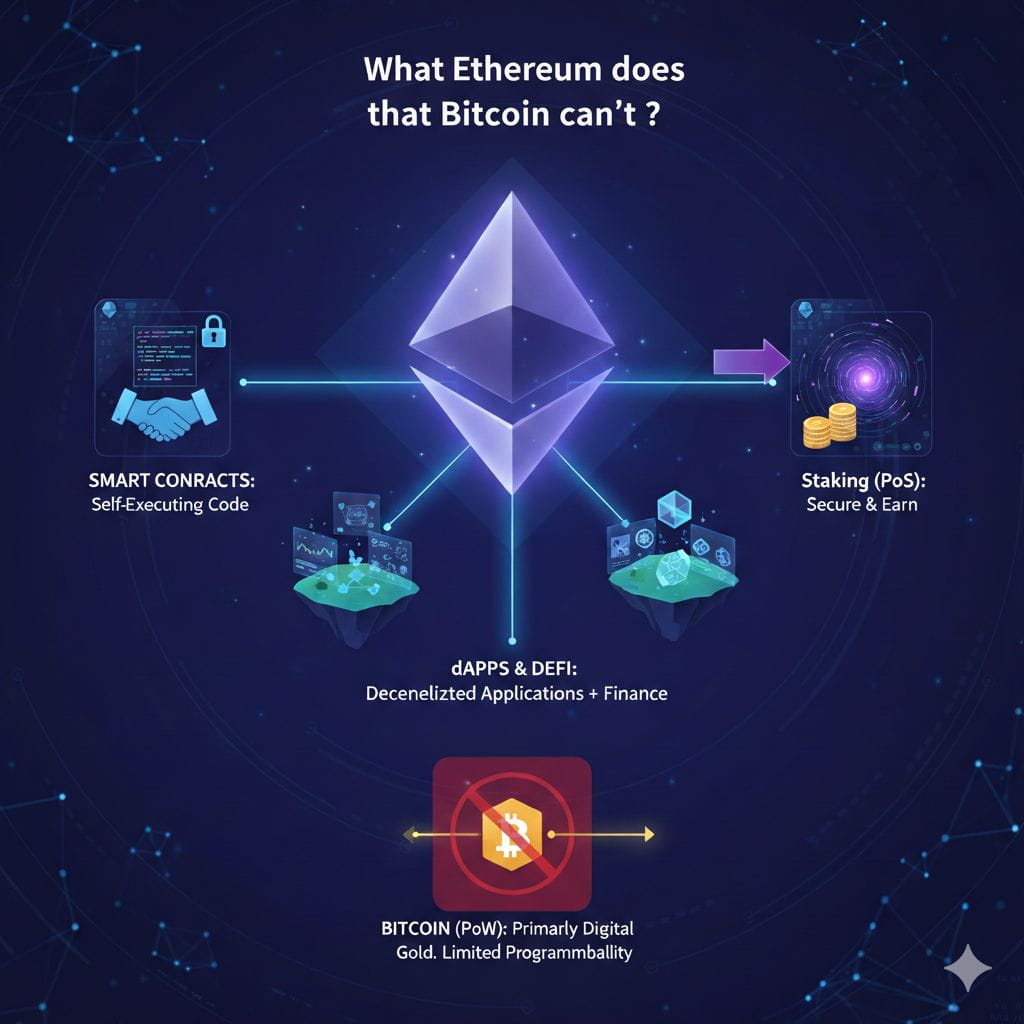 Ethereum is a blockchain that lets developers write smart contracts - pieces of code that automatically run when certain conditions are met. No middleman. No manual approval.