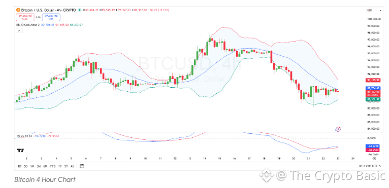 In the latest 4-hour chart for Bitcoin, the price shows consolidation between the upper and lower bands of the Bollinger Bands. The price briefly tested the middle band at $89,704, indicating initial resistance. However, the first-born crypto has pulled back toward the lower band based at $88,302, signaling a possible lack of momentum to break higher.