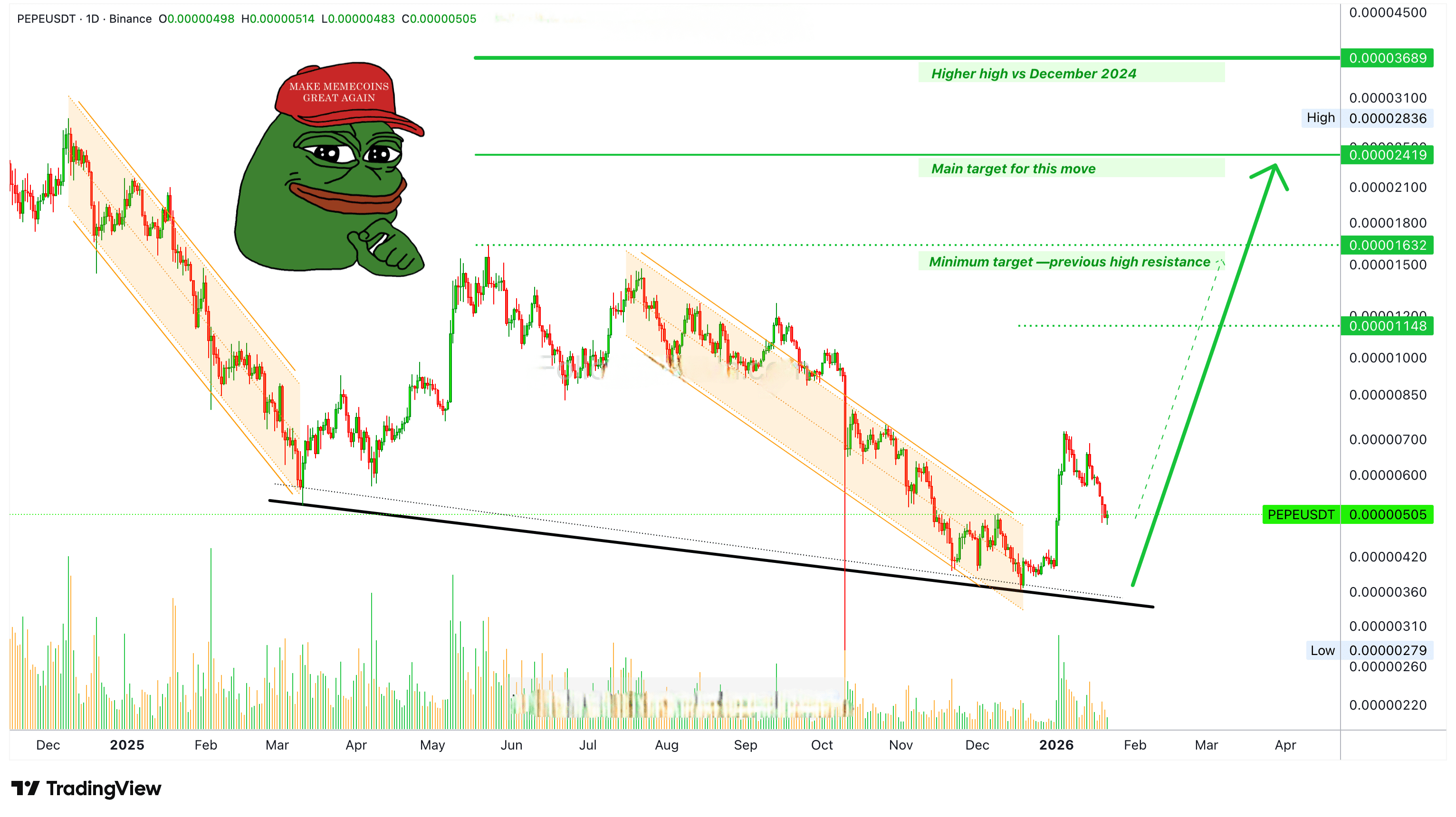 Si prega di consentire la rivelazione di obiettivi più alti per PEPEUSDT. Questo si è mosso in modo forte durante l'esplosione iniziale, e sembra che la correzione stia finendo oggi. Abbiamo un forte calo più alto, come ami sempre dire, "Compra quando il mercato è rosso, scambia a un prezzo basso o vicino al supporto."