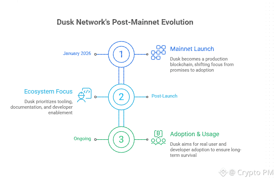 Mainnet launches are loud moments but what comes after is more important and more uncomfortable. After early January 2026 Dusk stopped being an idea and became a production chain and now the focus is not promises it is adoption developers users and real behavior.