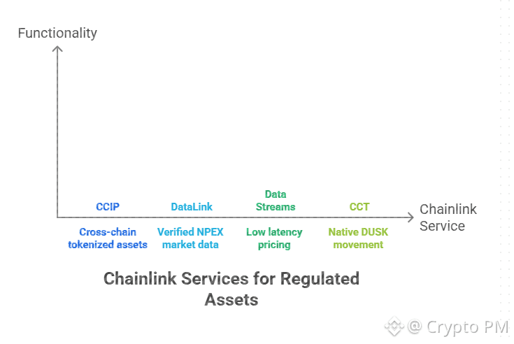 Chainlink integration is deep not decorative. CCIP handles cross chain tokenized assets. DataLink delivers verified NPEX market data. Data Streams provide low latency pricing. CCT enables native DUSK movement across chains.