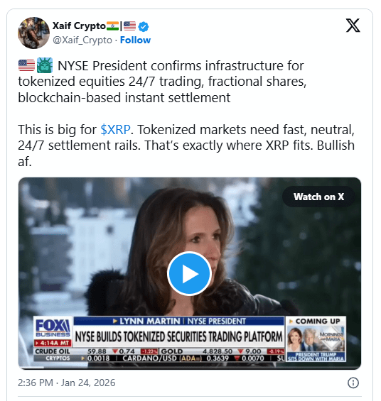 In un post su X, Xaif Crypto ha reagito ai commenti del presidente della NYSE Lynn Martin durante un'intervista con FOX Business. Afferma che la direzione confermata delle azioni tokenizzate si allinea strettamente con i punti di forza funzionali di XRP come asset di regolamento.