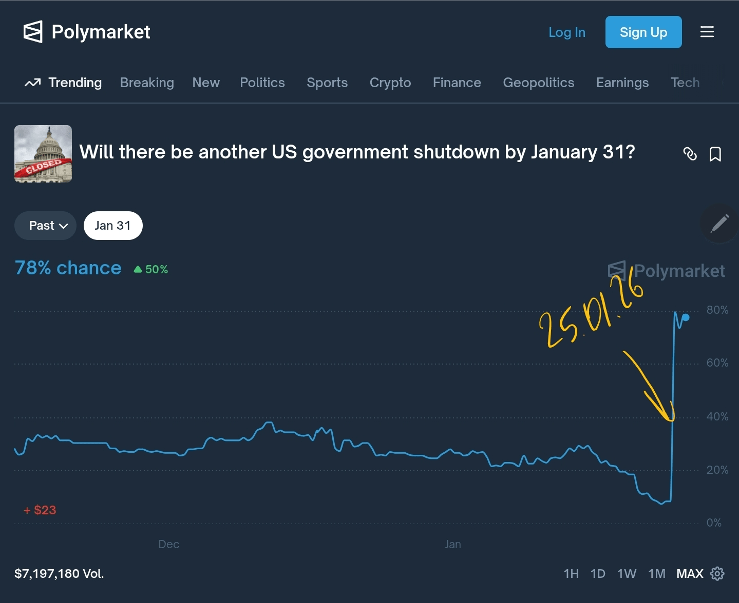 Также, что-то произошло в политике соединённых штатов, что вчера шансы закрытие парламента до конца января выросли аж до 78%, что может также сказываться угнетающе на цену.