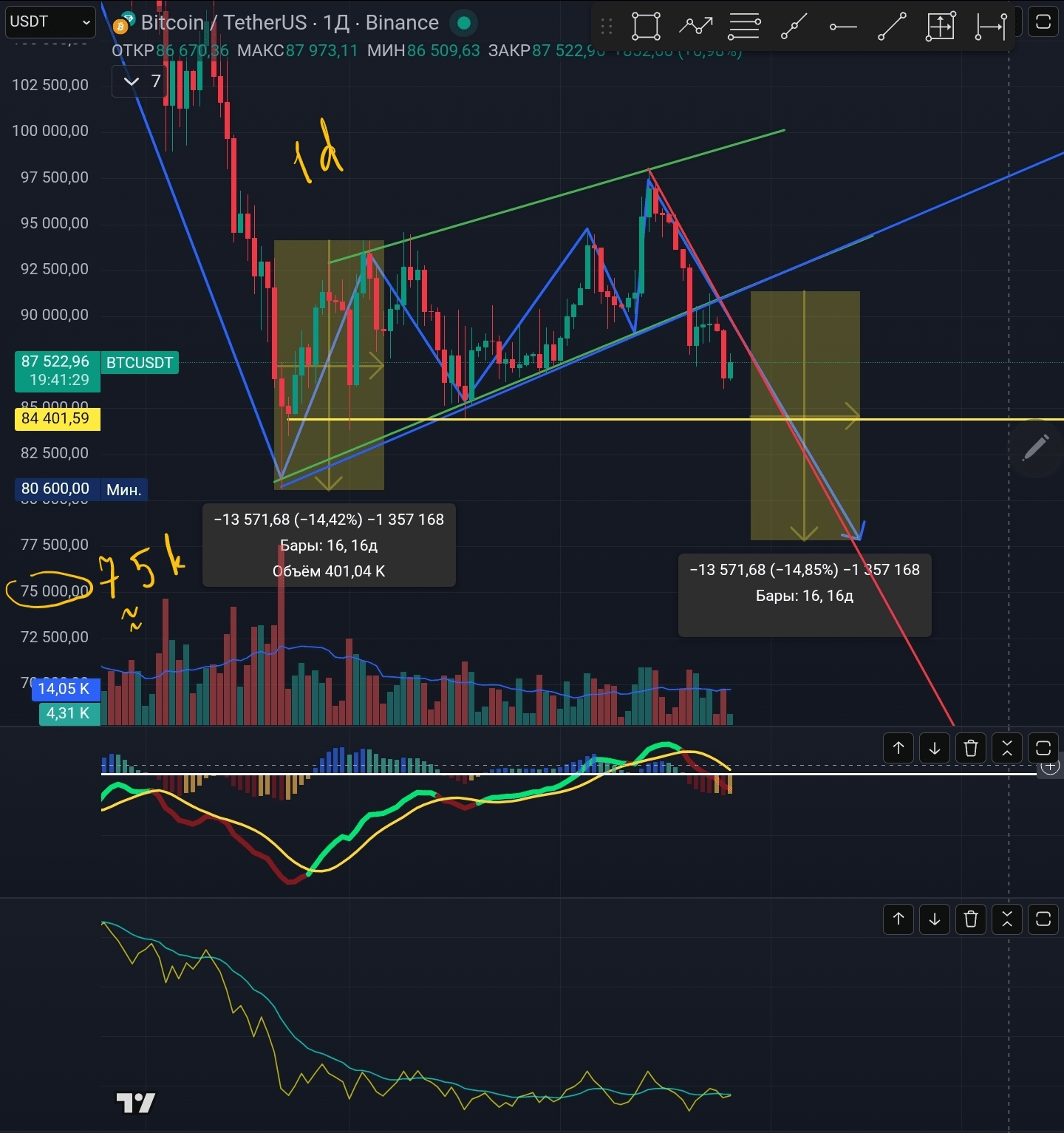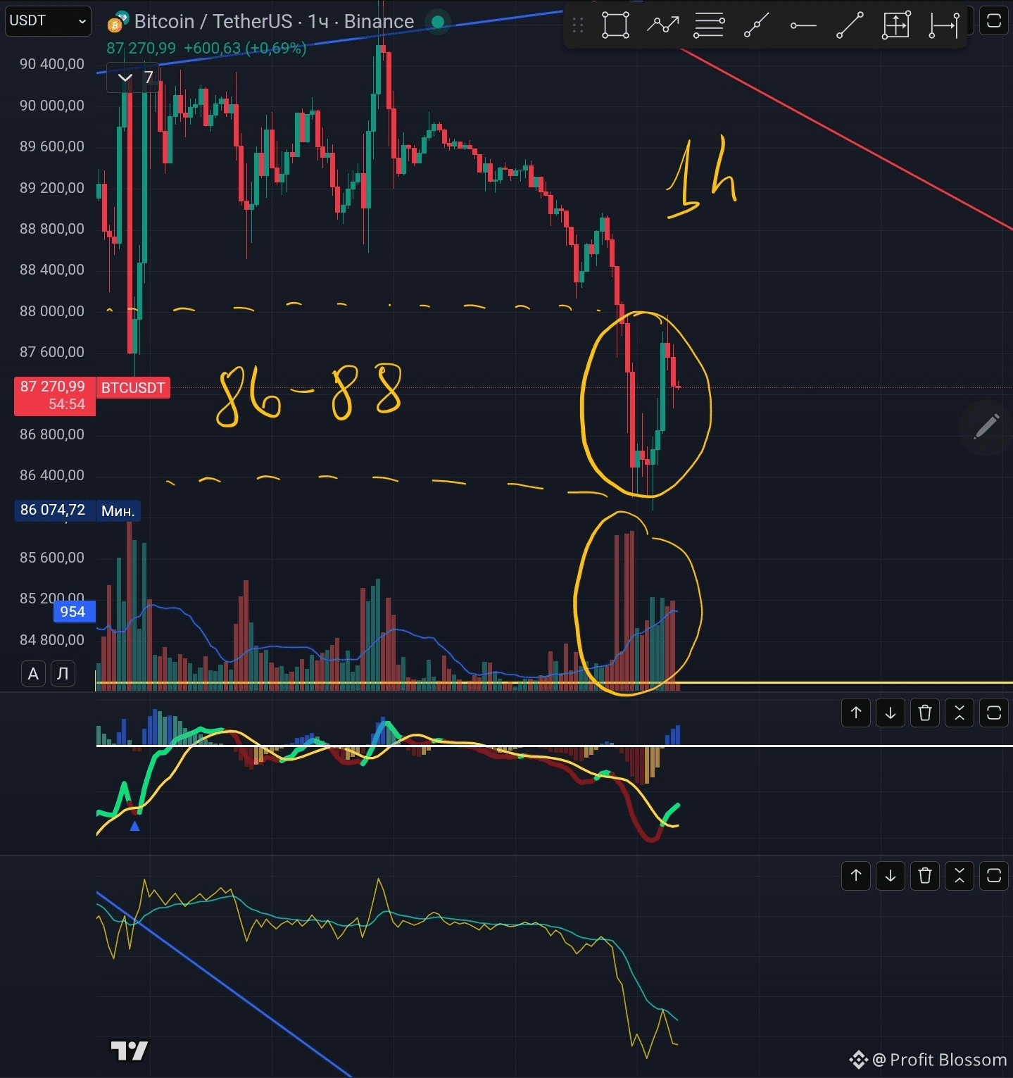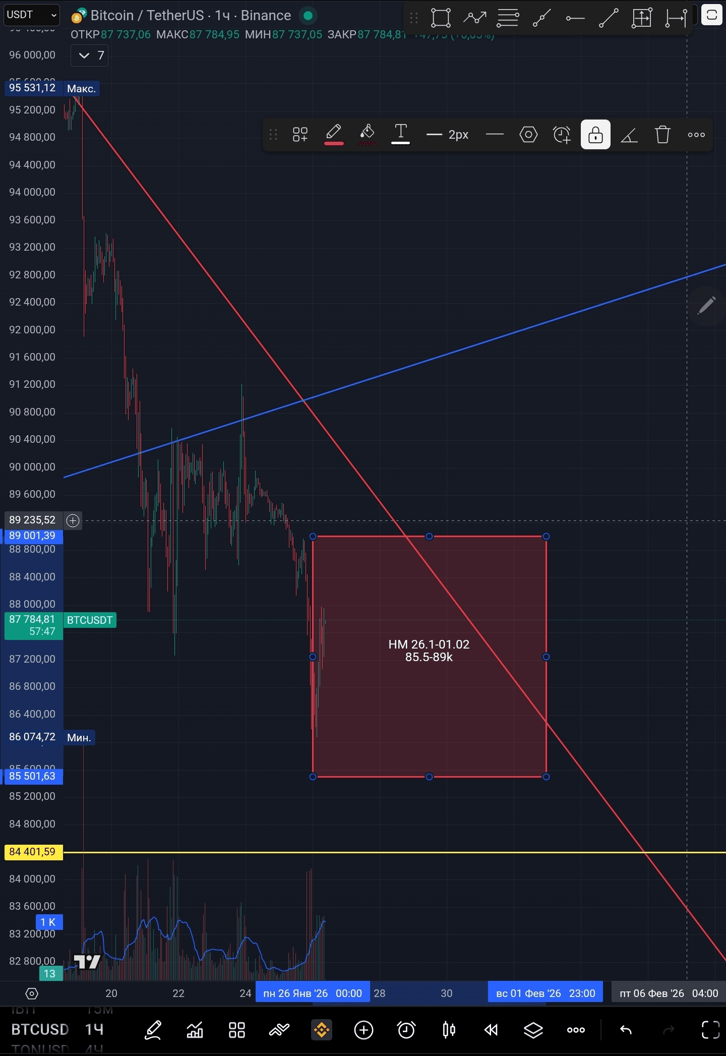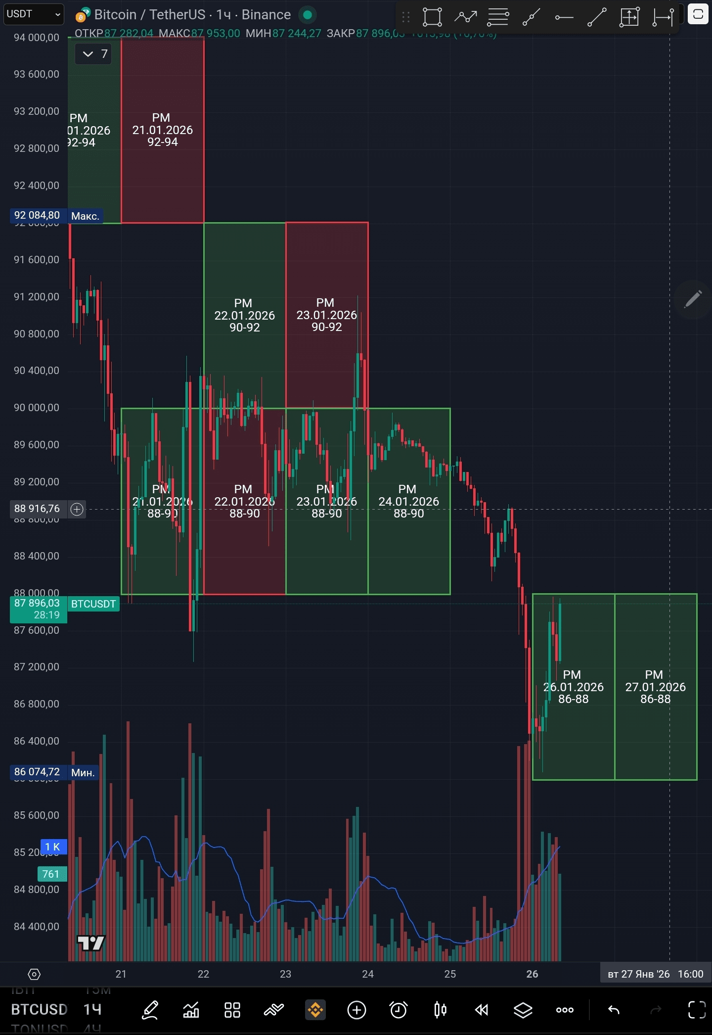 На часовых свечах, исходя из высоких объёмов, мы видим отчётливый интерес инвесторов в промежутке цен 86-88k. Могу предположить, что эта неделя как раз и пройдёт рядом с этим диапазоном цен