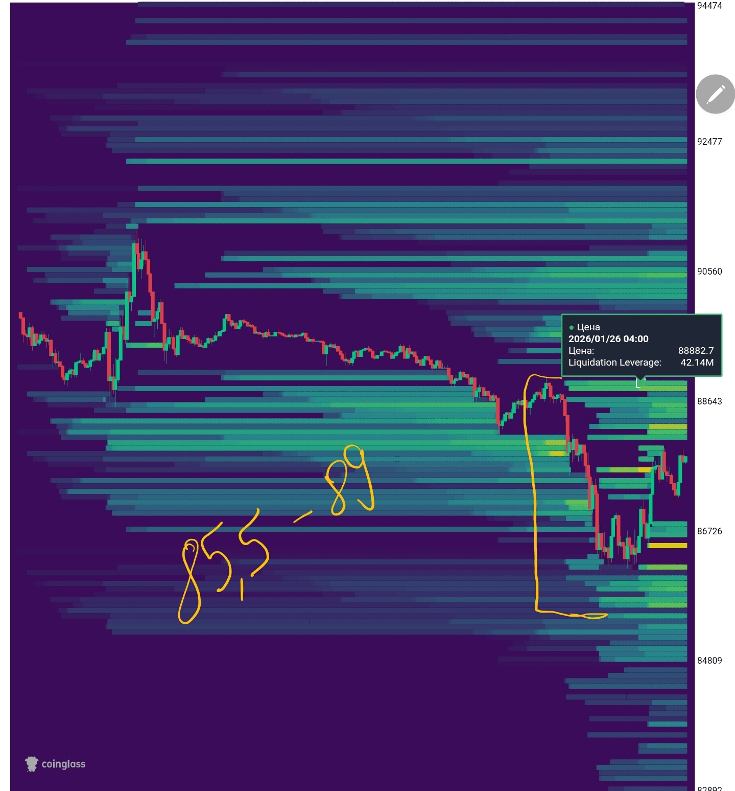 📍Вывод для себя я делаю следующий: цена движется в рамках своей среднесрочной нисходящей тенденции. Все видят уровень 84k и думаю там будут расположены лимитные ордера на покупку, от чего цена вряд ли сможет пробить её с первого раза. Для себя я ожидаю цену в диапазоне 84-88k на этой неделе. Тепловая карта там также показывает примерно те же цифры 85,5-89k