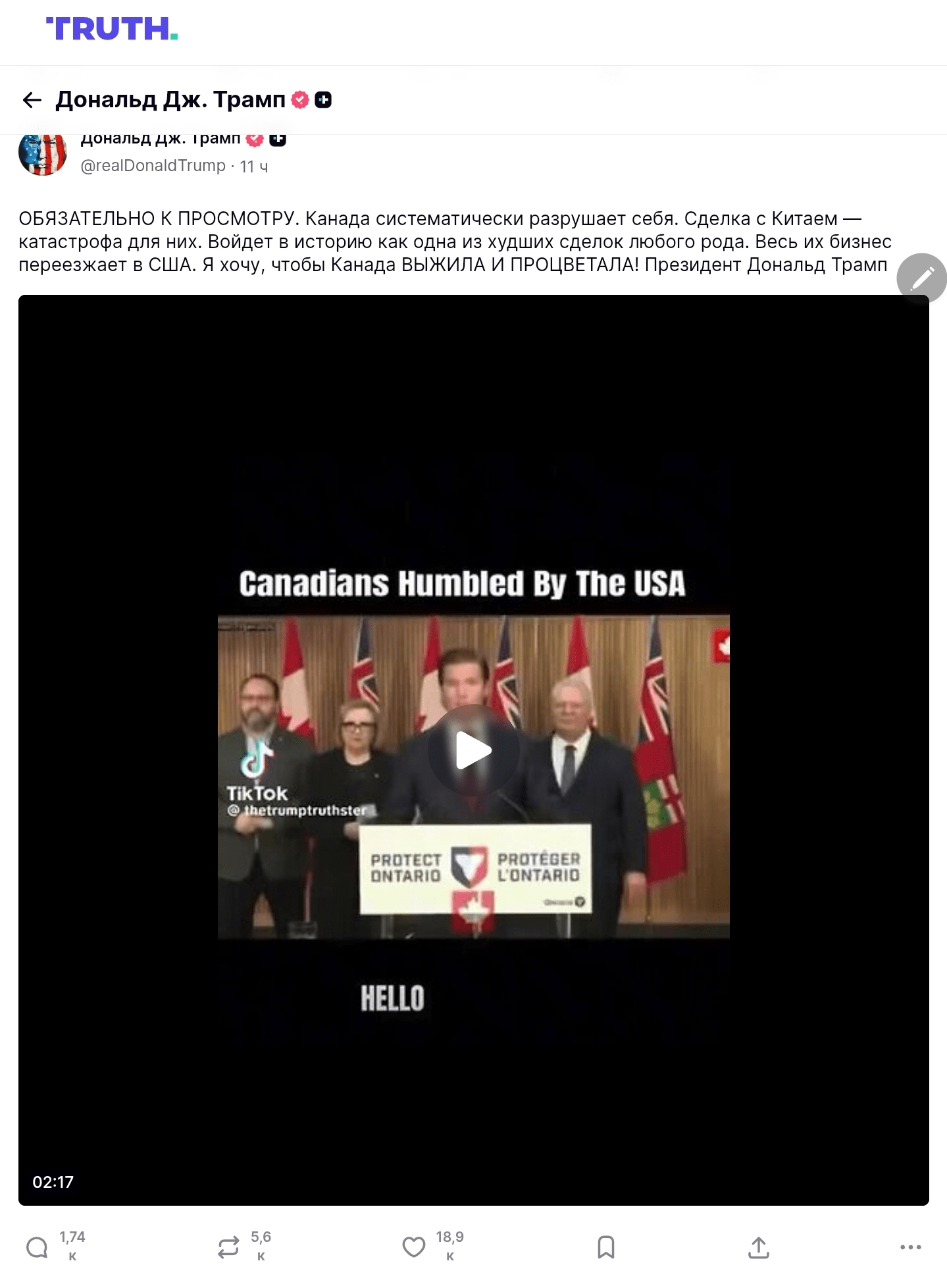 ОБЯЗАТЕЛЬНО К ПРОСМОТРУ. Канада систематически разрушает себя. Сделка с Китаем — катастрофа для них. Войдет в историю как одна из худших сделок любого рода. Весь их бизнес переезжает в США. Я хочу, чтобы Канада ВЫЖИЛА И ПРОЦВЕТАЛА! Президент Дональд Трамп