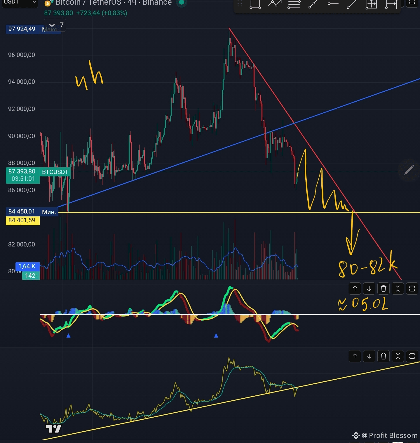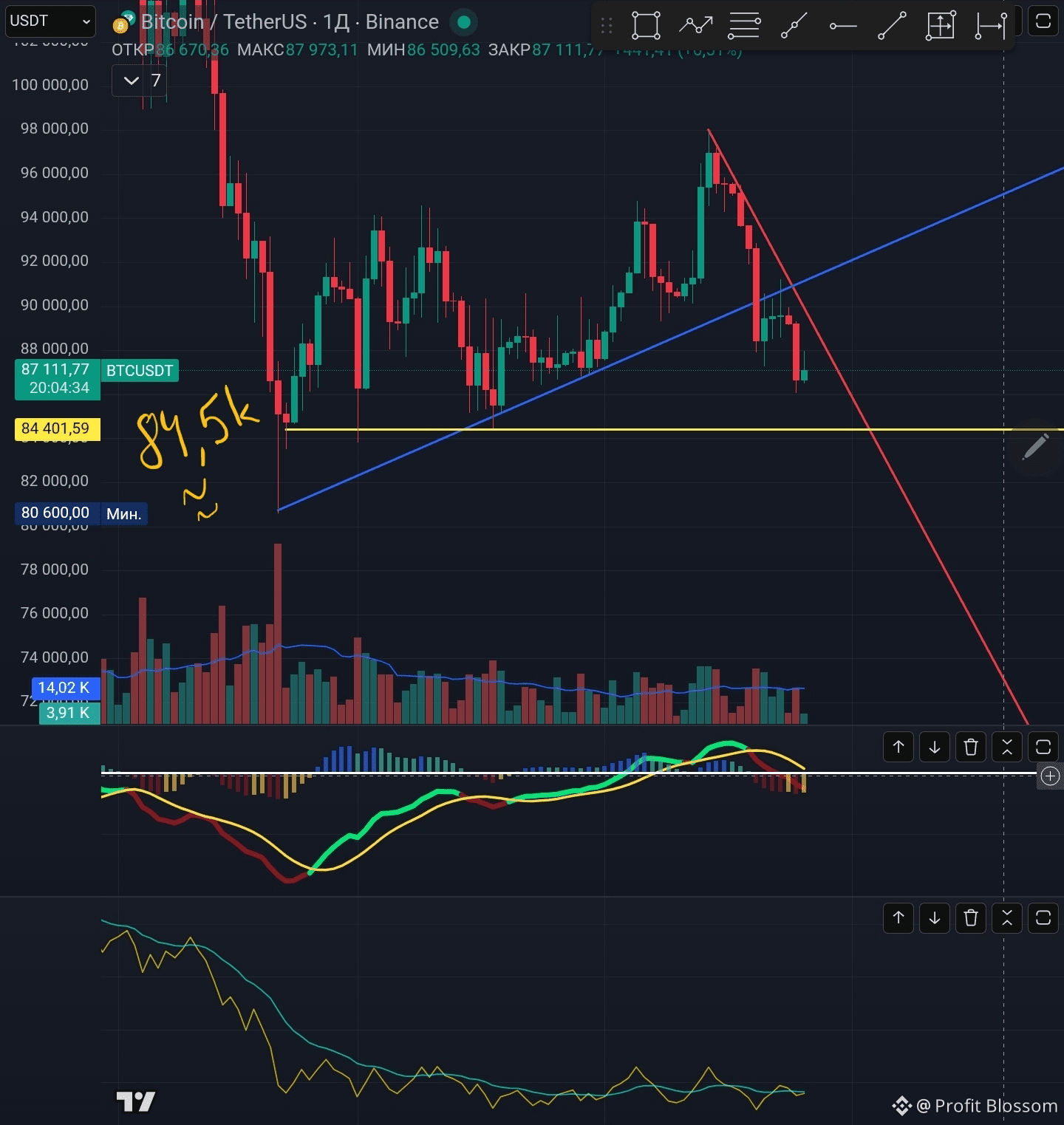 📍Доброе утро дорогие друзья, после выхода из восходящего клина, на графике образовался нисходящий тренд, цена в ближайшее время будет тестировать уровень 84,5k.