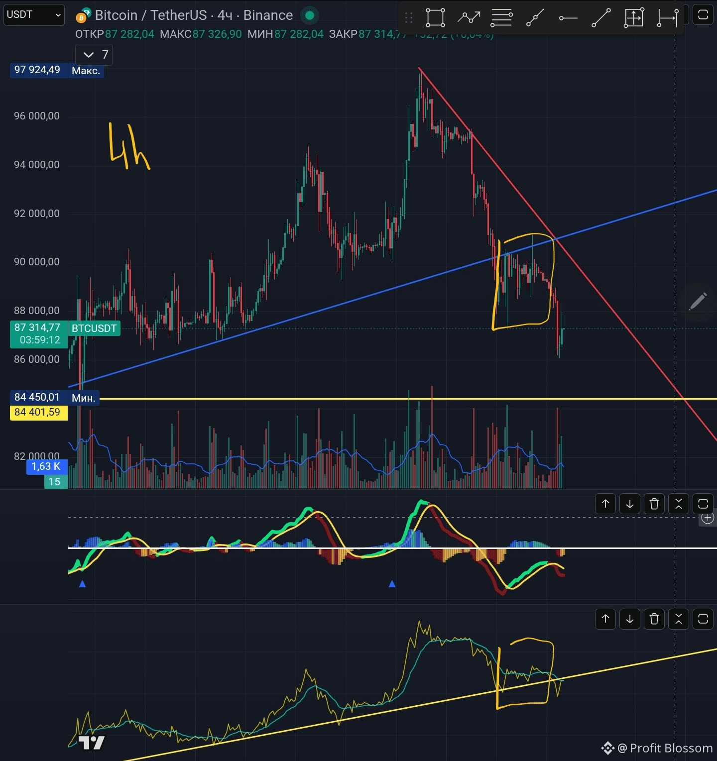 На 4 часах мы можем видеть пробитие восходящей трендовой линии балансового объёма, хочу заметить даже после уверенного пробития цены, балансовый объём всё ещё нам сигнализировал о восходящем тренде и только после недавнего спуска до уровня 86k линия индикатора была прорвана, что сигнализирует о реальности направления цены.