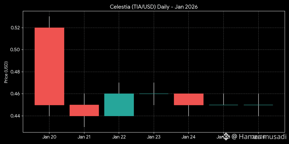 Market Sentiment: Neutral/Boring. TIA is trading at approximately $0.45, hovering near its "cost-of-attention" floor.