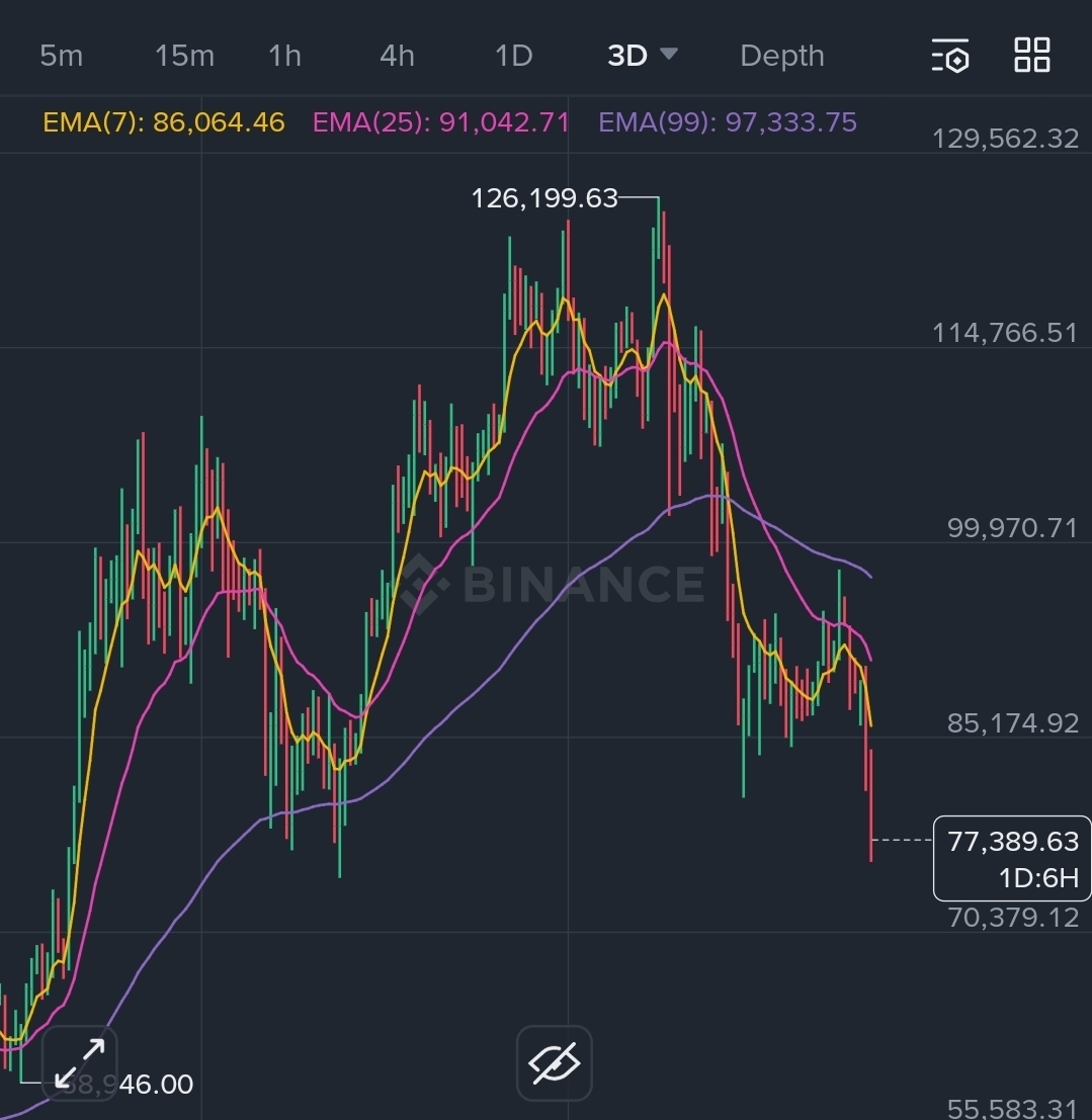 Ciao fam di Binance Square! $BTC sta testando la determinazione dei tori in questo momento – scambiando a ~$77,389.63 dopo un brutto calo di 1D di 6H (questo è un serio movimento di candela rossa!). Con le vibrazioni del mercato più ampio che cambiano, è questo il calo da acquistare o una porta trap per minimi più bassi? Analizziamo questo grafico 3D come dei professionisti. 🔥
