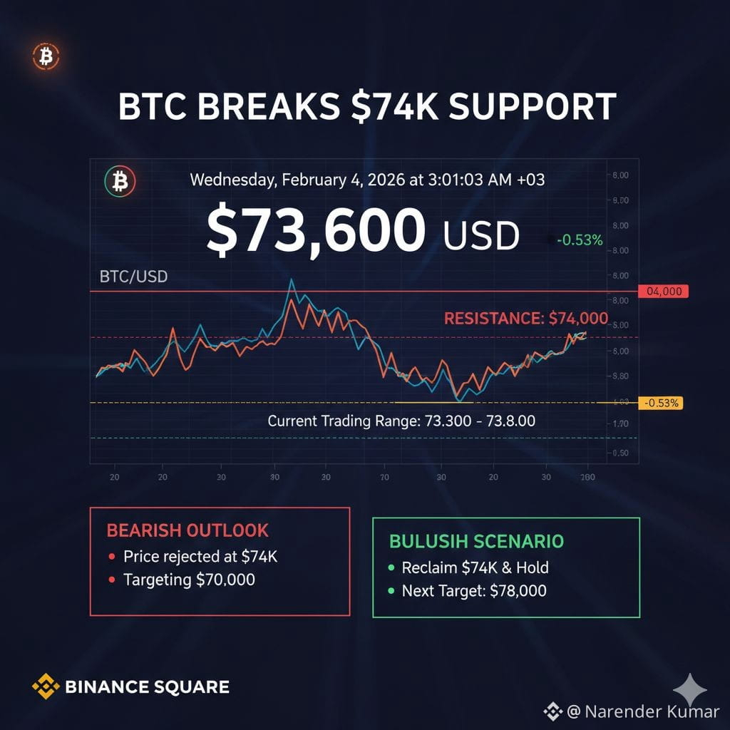 đ¨Bitcoin has officially lost the critical $74K$BTC support zone, currently trading around $73.6K. When a major daily floor like this cracks, we stop guessing and start watching for one specific signal: Is this a "Fakeout" or a "Breakdown"?