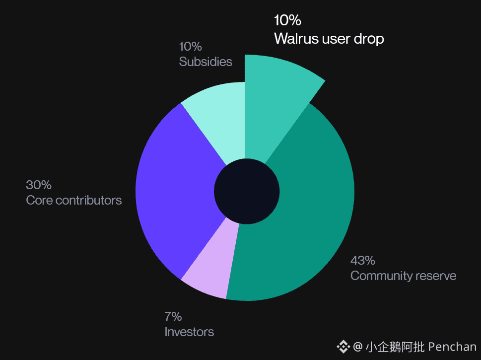 Walrusトークン経済学で最も注目されているのは、エアドロップの配分が10%を占めていることです。現在、WALはSuiユーザーに4%をエアドロップし、この部分のルールはまだ公表されていません。小企鵝の理解によれば、NSドメインの保有者、持続的にインタラクションしているユーザー、および一部のNFT保有者がそれぞれ異なる量のトークンを受け取っています。