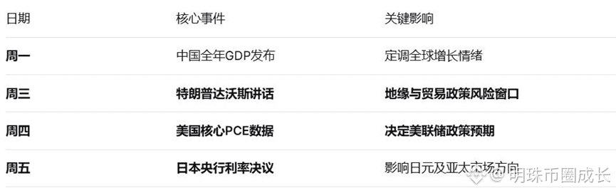 下周宏观风险高度密集,核心是特朗普在达沃斯论坛(周三)的讲话。其关于格陵兰岛关税威胁(拟对欧8国加征)的任何表态,都将直接冲击全球市场风险偏好。与此同时,美国核心PCE物价指数(周四) 将严峻考验市场对美联储降息的激进预期,数据过热可能引发紧缩担忧。日本央行决议(周五) 则可能因政治局势而释放意外信号,扰动亚太市场。