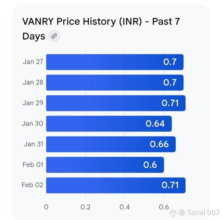 The live price of Vanar Chain ($VANRY ) today, February 2, 2026, is approximately $0.006225 USD. In local currency, the price is roughly ₹0.76 INR. The market cap currently sits at about $13.8 million USD (₹1.38 billion INR), ranking it around #1278 in the global cryptocurrency market.