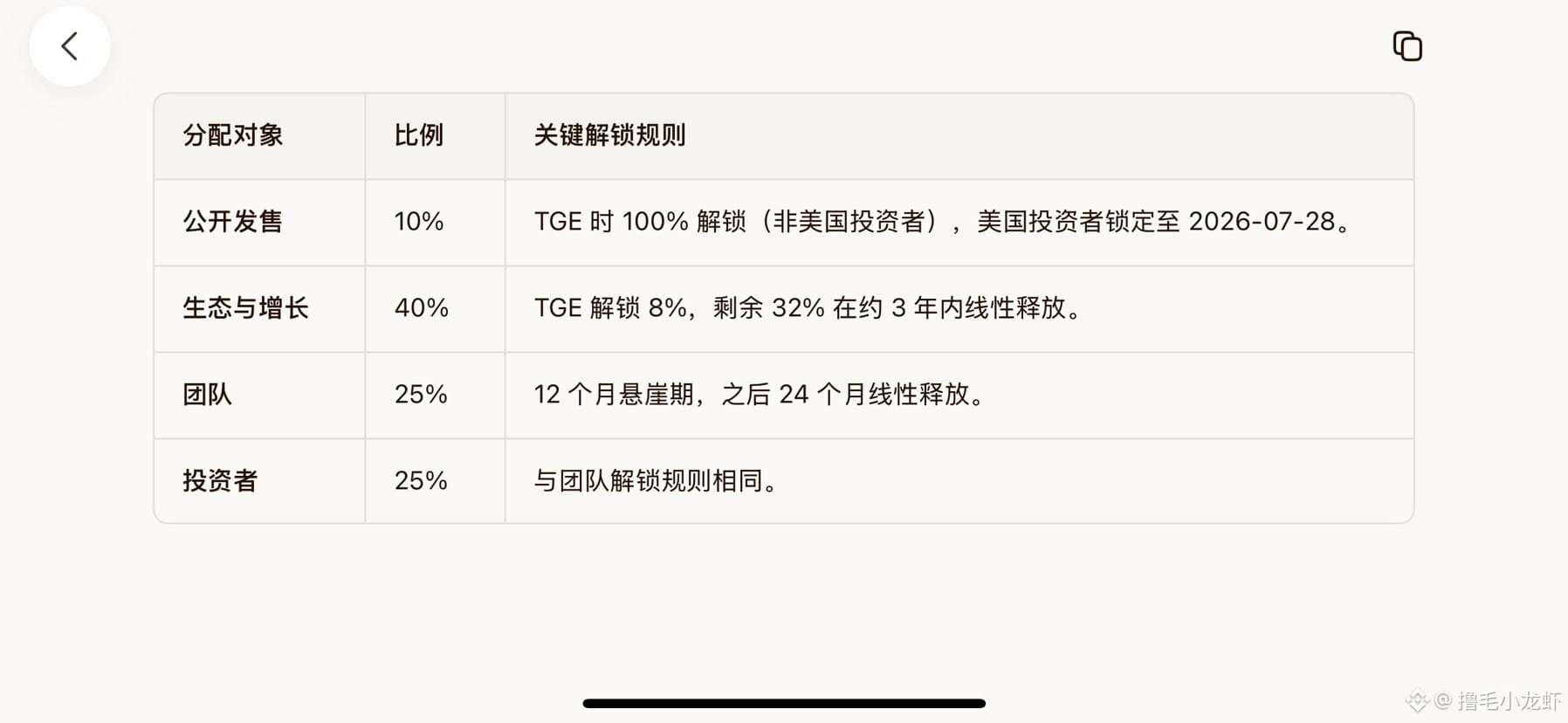 高估值与解锁抛压:早期流通量低导致 FDV 极高,而团队和投资者代币在 2026 年中开始大规模解锁,存在巨大抛售压力。