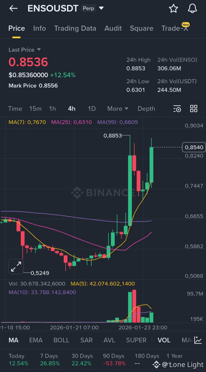 ENSO đã tăng hơn 43% trong một phiên giao dịch, tăng từ khoảng $0.60 lên $0.85. Theo Crypto.com, ENSO tăng 10.68% trong 24h qua, cho thấy sự tăng trưởng liên tục.