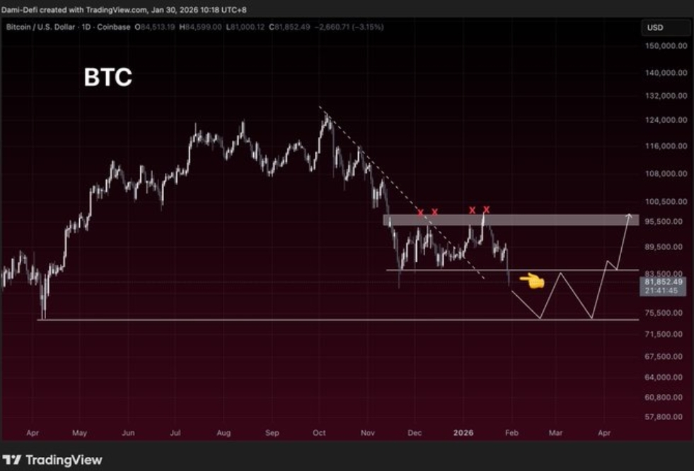 Хотя чистое дневное закрытие ниже 84 000💲 пока не подтверждено полностью, аналитики считают, что такой шаг откроет дверь к более глубокому снижению в диапазоне 74 000–76 000💲- долгосрочной зоне поддержки.