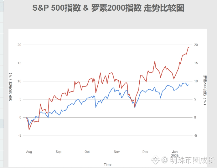 最近市场有个现象值得深聊:美股小盘股(以罗素2000指数为代表)已经悄然跑赢标普500指数一段时间了。 这看似是传统金融市场的内部事务,但我的观点是,这可能是观测整个全球风险偏好能否向加密货币更深处扩散的一个关键“前哨站”。