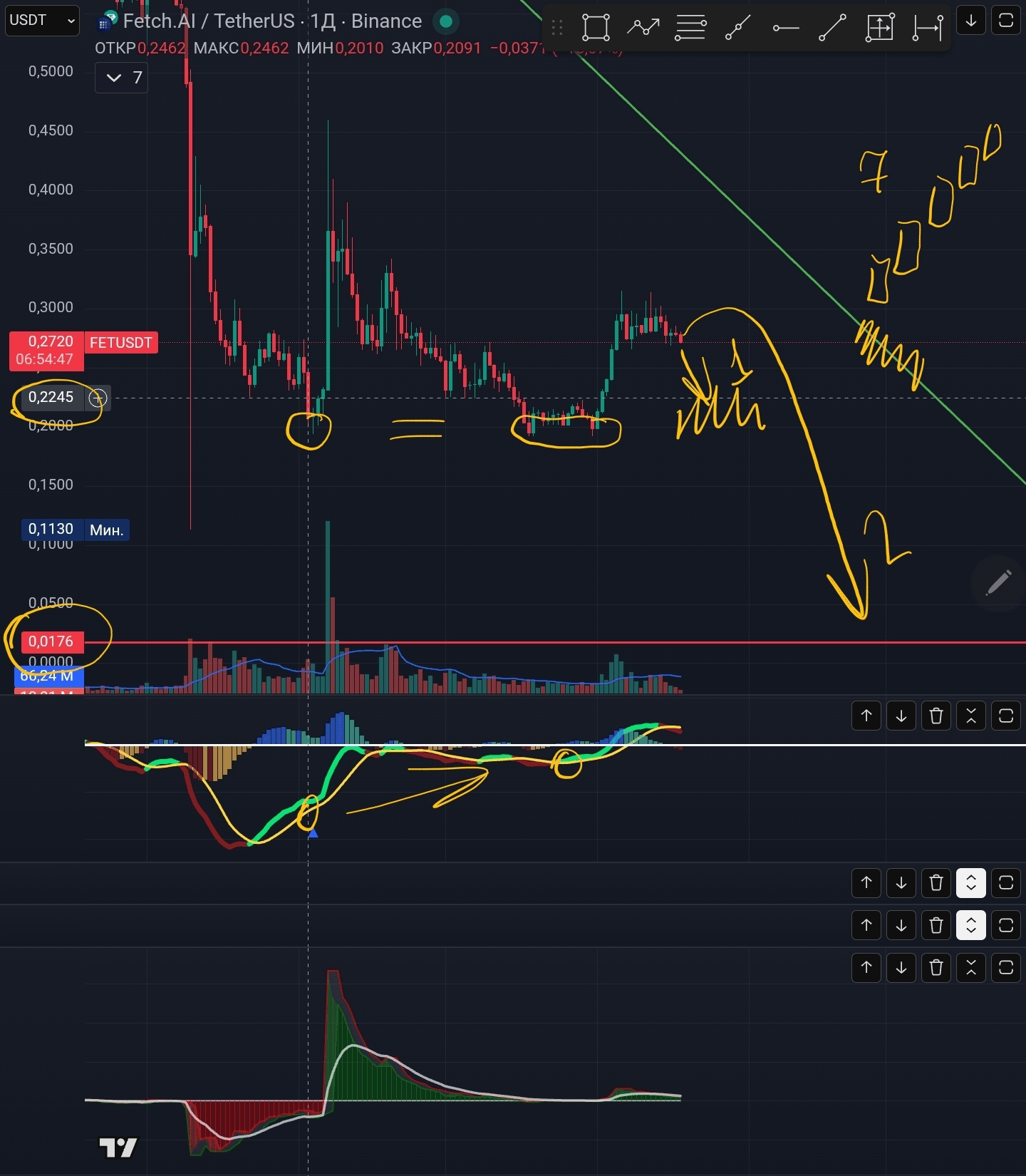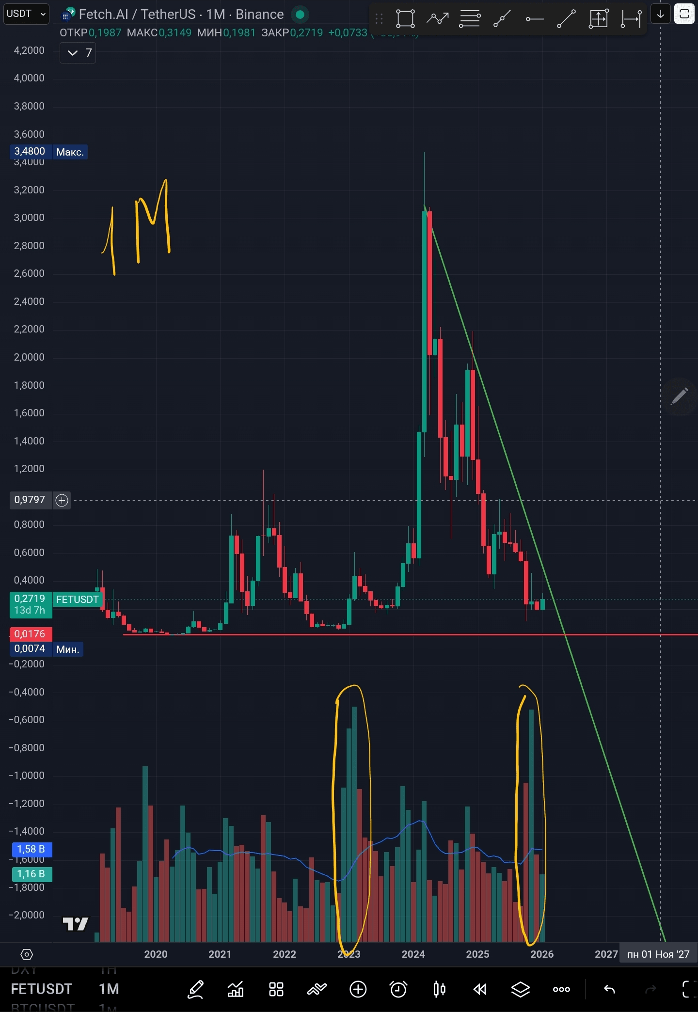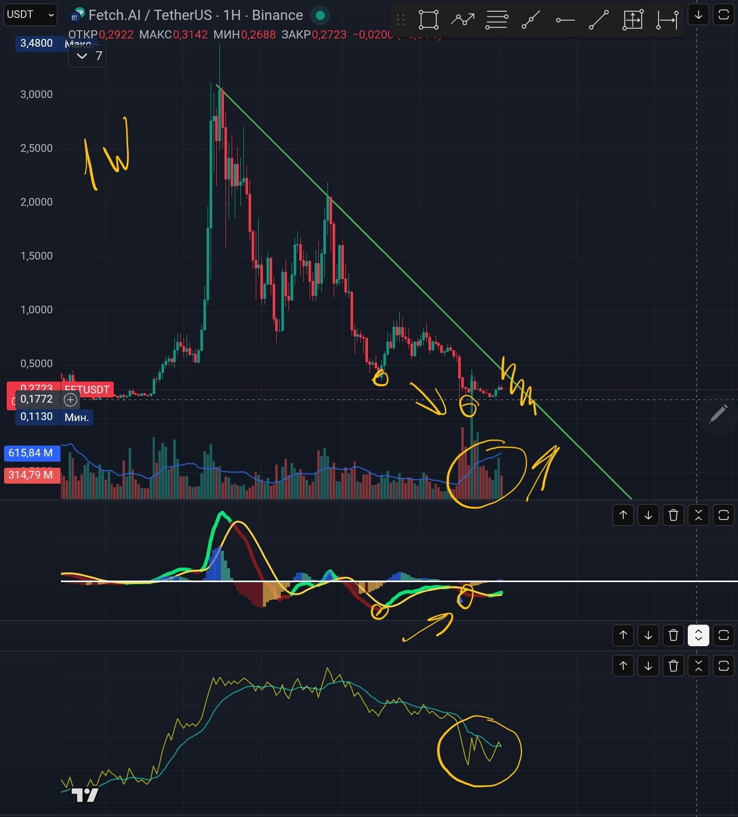 Sakšu uzreiz, es pirmo reizi dzirdēju par $FET , neesmu to turējis un vados tikai pēc tehniskās analīzes. Uz nedēļas grafikām novērojama bullisks divergences - cena iet uz leju, bet MACD sāk kāpt. Apjoma indikators cenšas pārraut savu kustīgo vidējo, kas arī ir labs signāls. Pievērsiet uzmanību strauji pieaugušajiem apjomiem apmēram 0,25