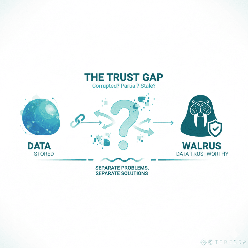 This is the gap between "data is stored" and "data is trustworthy." Most systems conflate them. Walrus treats them as separate problems that need separate solutions.