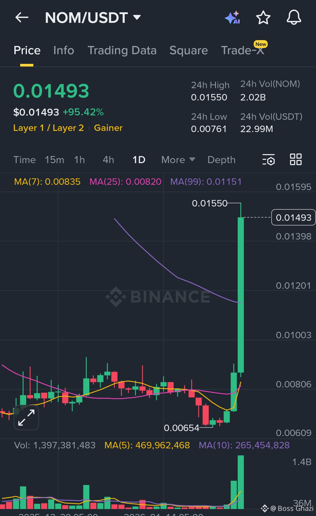The NOM/USDT pair has just witnessed a massive volatility expansion, printing a +95% gain in a single daily candle. This move signifies a decisive shift from a long-term Accumulation Phase into a violently bullish Markup Phase. The market structure has completely flipped, invalidating previous bearish trends.