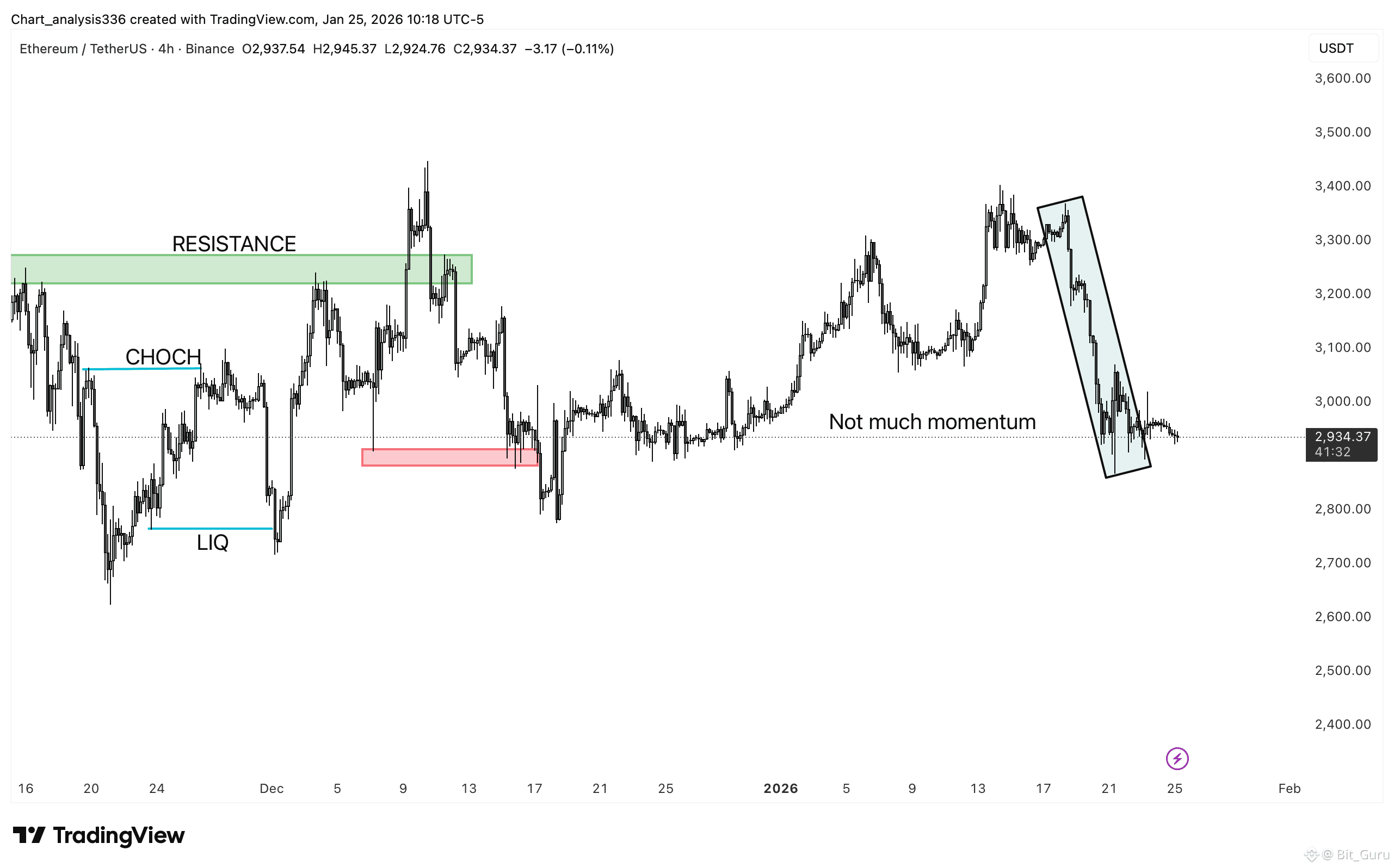 Structurally, ETH has already reacted from a prior resistance zone and then moved into a corrective channel with declining momentum. This type of behavior often appears after an impulsive move, where both buyers and sellers step back. As long as price remains capped below the recent lower high and volume stays muted, any upside attempts are likely to be slow and corrective rather than explosive.