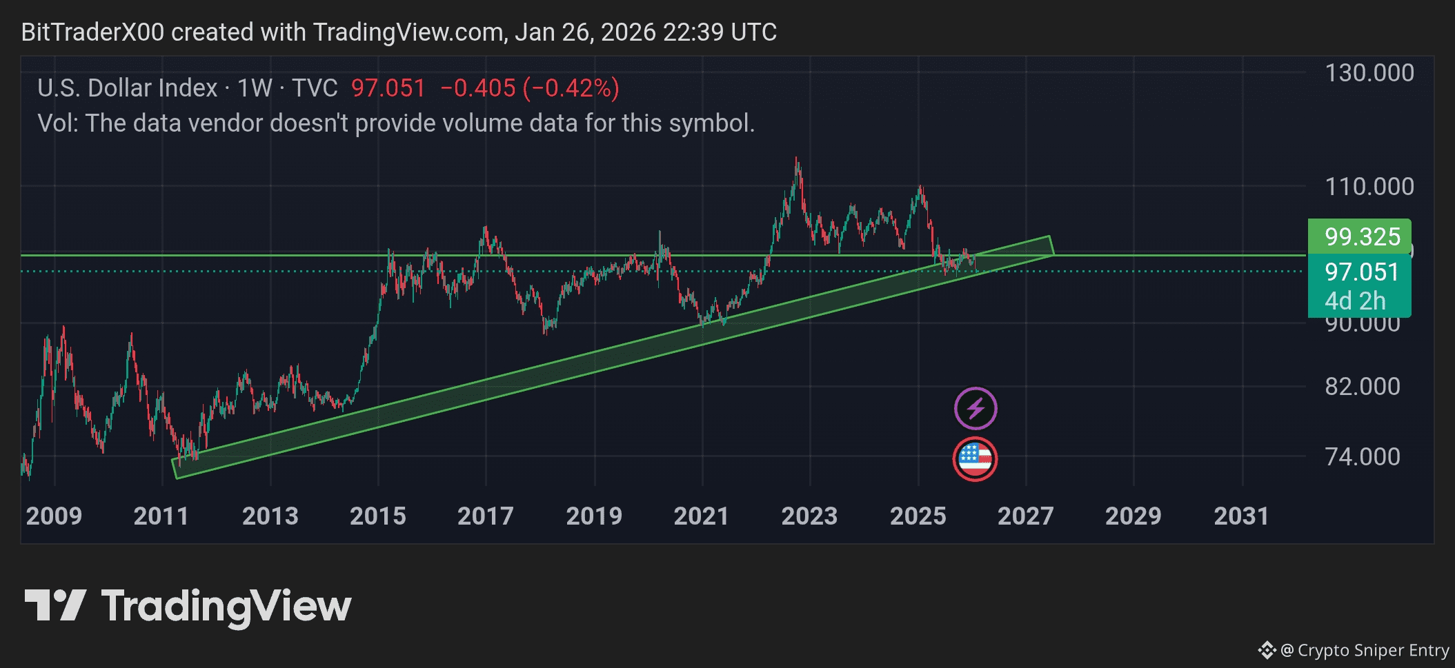 For more than a decade, DXY has respected a rising trendline (marked in green). This trendline has acted as a long-term support since around 2011. Every major touch of this zone previously led to a bounce in the dollar.