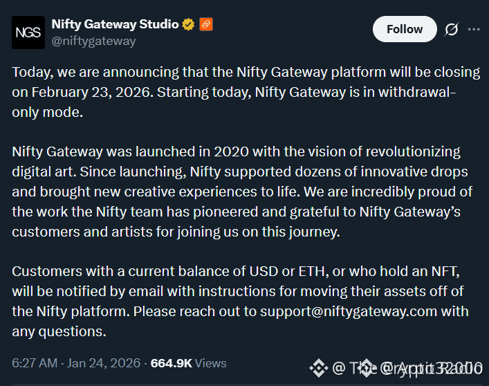 Nifty Gateway, one of the earliest and most prominent NFT platforms (launched around 2020 after Gemini acquired it in 2019), will fully shut down on February 23, 2026. As of January 24, 2026, it entered withdrawal-only mode — meaning no new purchases, sales, listings, or trading are possible, and users have until the closure date to withdraw their remaining assets (NFTs, ETH, or USD balances).