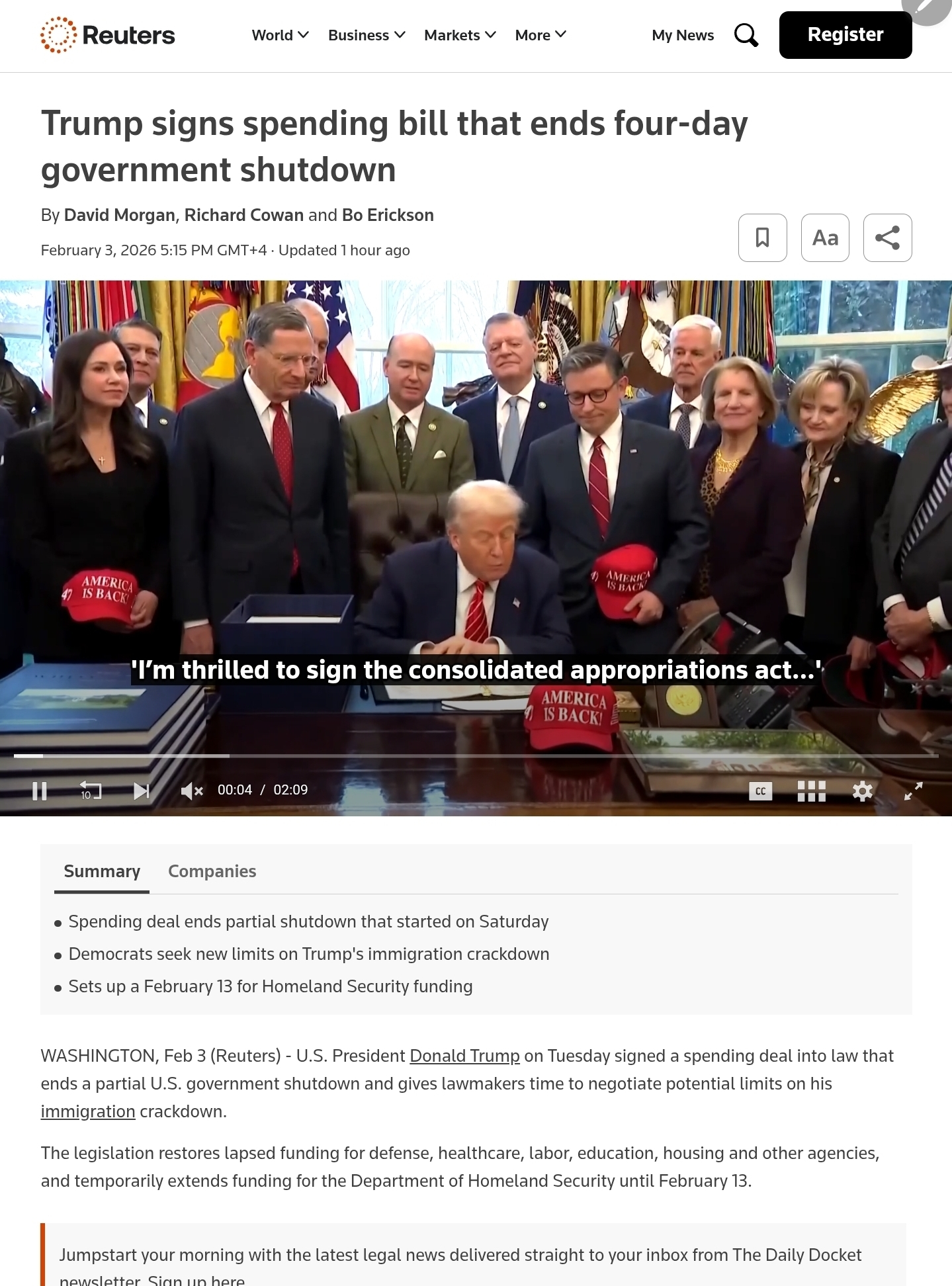 ❗❗❗Ничего интересного не по экономике, не по внешней политике, не по возобновлению работы парламента. В особенности меня волновало возобновление работы правительства. Я поискал в новостях и да, действительно, один час назад был подписан законы выделении средств федеральному ведомству, что является прекращением шатдауна, который длился 4 дня ❗❗❗
