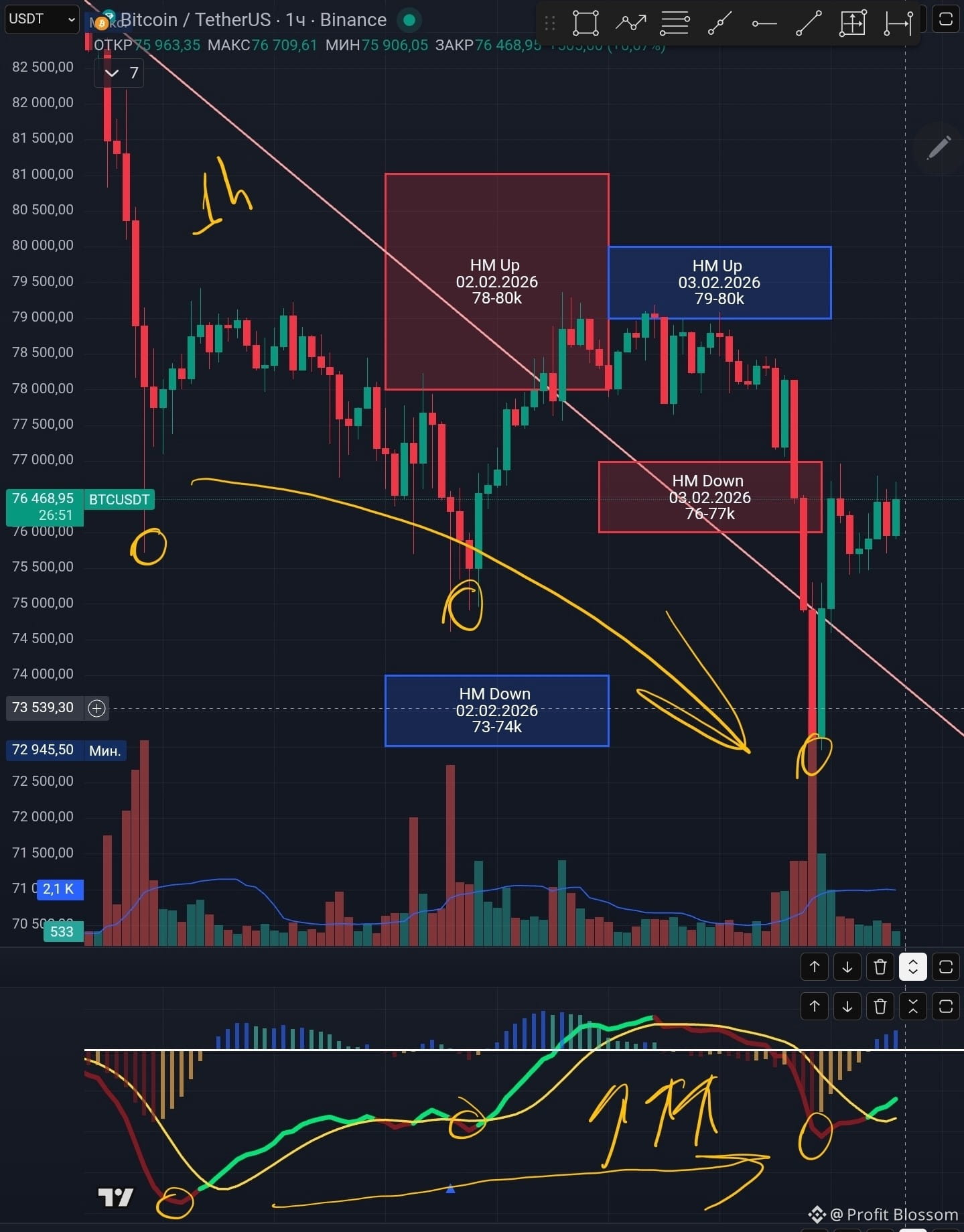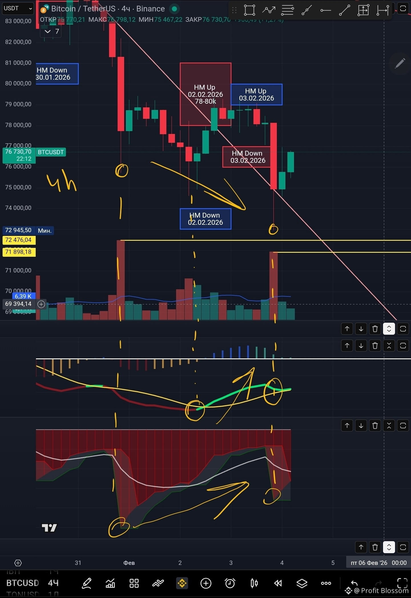 ❗Что же касается настоящего момента, тепловая карта, ночной ретест нисходящей линии поддержки, дивергенции и позитивные новости из США мне говорят о том, что мы должны забирать уровень 78-80k. При более удачном исходе событий мы должны в ближайшие дни протестировать красную нисходящую линию сопротивления.