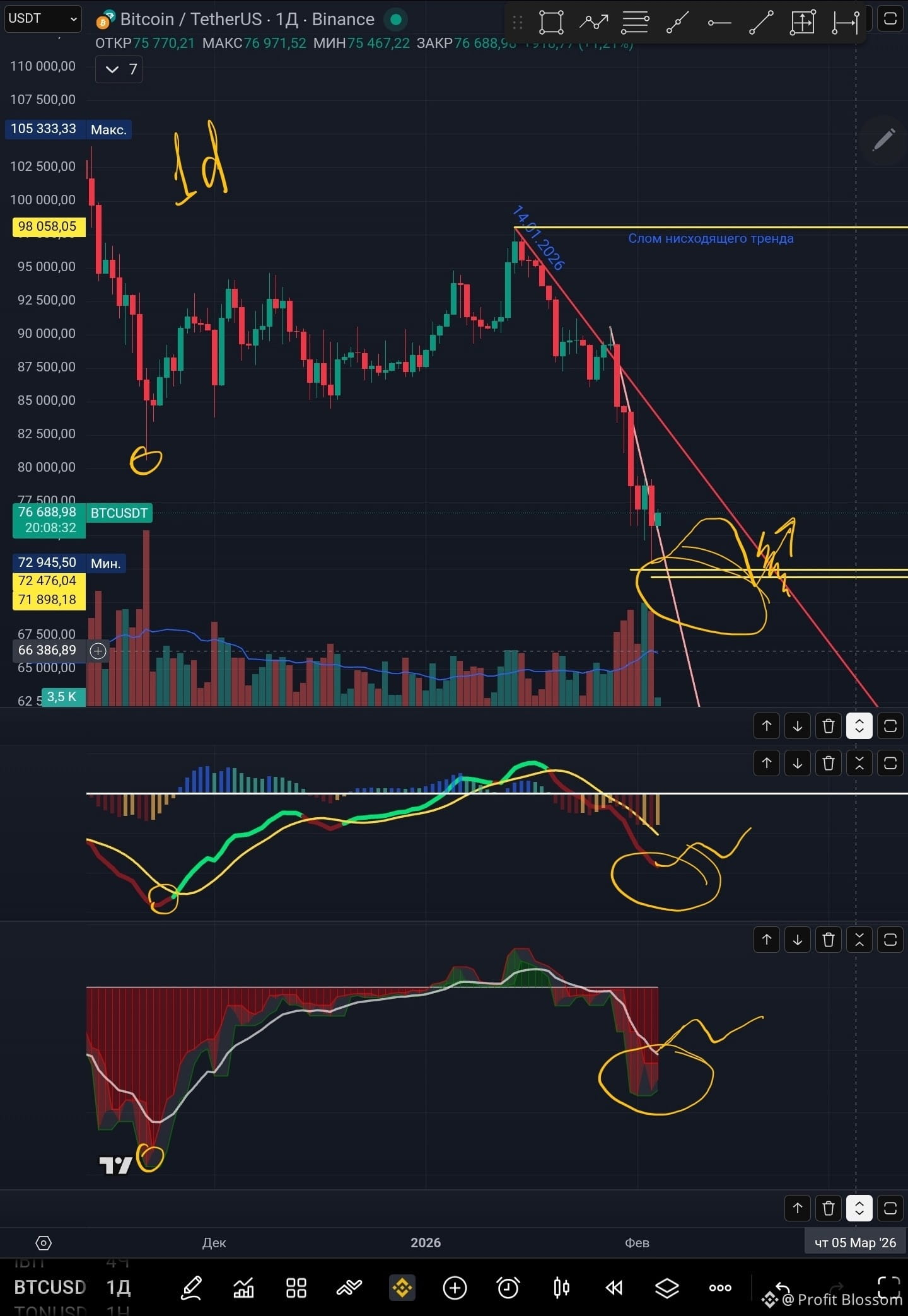 Для максимальной уверенности я бы конечно хотел ещё увидеть окончание формирования на однодневных свечах, вот в таком виде: цена приходит первый раз к красной линии сопротивления, отскакивает от неё, делает короткий лой, с обновление предыдущего, в район 70k и возвращается к красной линии сопротивления, в идеале с пробитием данной линии сопротивления.