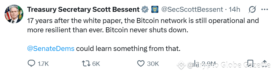 Bessent opublikował na X (dawniej Twitter) 31 października definicję 'zawsze włączonej' sieci Bitcoin i stwierdził, że 'ustawodawcy mogą się z tego czegoś nauczyć.'