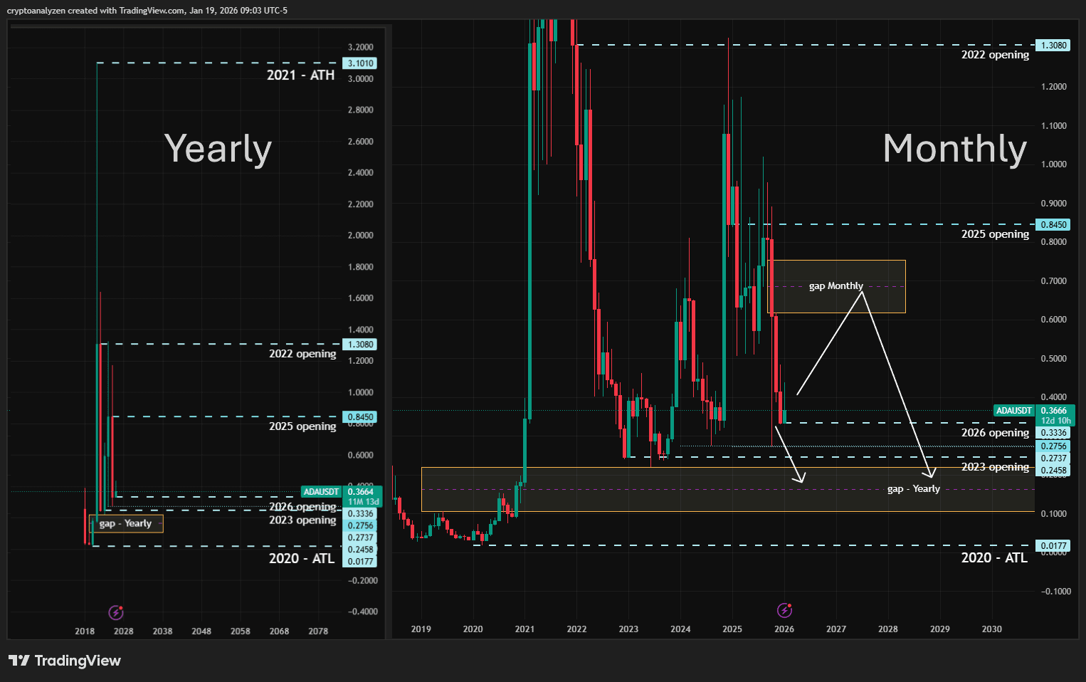 Po meteorycznym wzroście w 2021 roku do rekordowego poziomu 3.1010, ADA próbowała kontynuować wzrost, ale każdy kolejny rok nie zdołał utrzymać tego impetu. W 2024 roku cena krótko przetestowała poziom otwarcia 2022 roku na 1.3080, ale nie nastąpił żaden strukturalny odwrót.