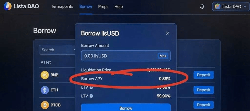 Po wpłaceniu aktywów możemy już "pożyczyć pieniądze". Pożyczamy stablecoin lisUSD (USD1) od Lista DAO.
