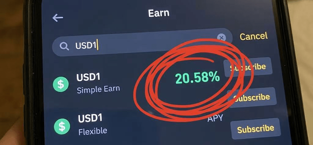 Operacja: Na stronie głównej aplikacji Binance znajdź 【Finanse】 (Earn) -> Szukaj waluty 【USD1】.