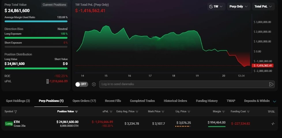 Mniejszy gigant w porównaniu, ale nadal ogromny według jakiejkolwiek ludzkiej miary, 24,8 miliona dolarów całkowitej ekspozycji, spadek o około 1 milion dolarów, utrzymując prostą pozycję 8,000 ETH long.