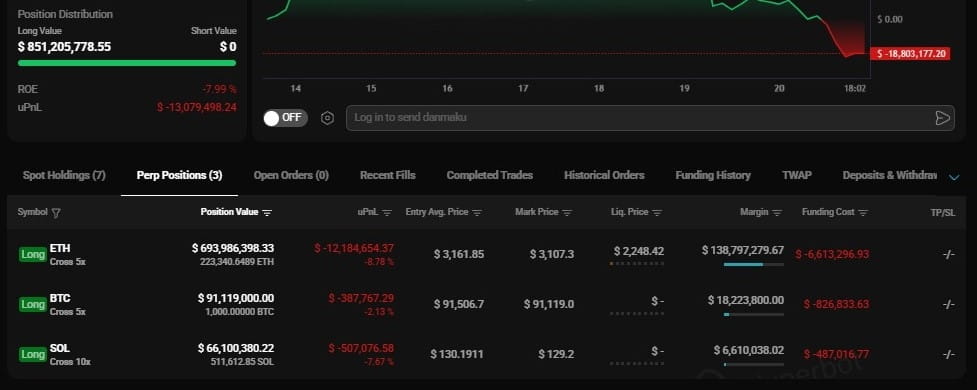 Jest tam infamijny “flash crash insider” wieloryb, 0xb317d2bc2d3d2df5fa441b5bae0ab9d8b07283ae. To konto posiada najlepszy long ETH Hyperliquid i zajmuje trzecie miejsce w BTC longs. Skala jest nierealna -- 851 milionów dolarów całkowitej wielkości pozycji, obecnie z niezrealizowaną stratą 13 milionów dolarów. Ekspozycja obejmuje 1,000 BTC, oszałamiające 223,340 ETH i 511,612 SOL. To zakład, który się nie waha. Nawet pod wodą, pozostaje.