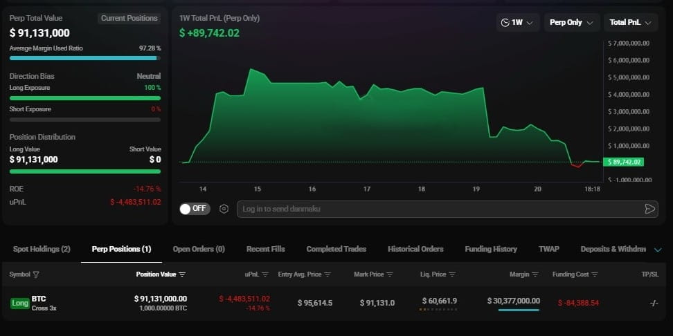 Bitcoin potrzebował tylko jednego tygodnia, aby sprintować do 98k... i kolejnego tygodnia, aby zjechać z powrotem do 91k. Na rynku takim jak ten, handel perps nie jest dla słabych. Albo przychodzisz z absurdalnym kapitałem, albo nerwami ze stali. A w tej chwili Hyperliquid wygląda jak koloseum. Najwięksi gracze patrzą sobie w oczy, stawiając zakłady, które większość z nas nawet nie może sobie wyobrazić.