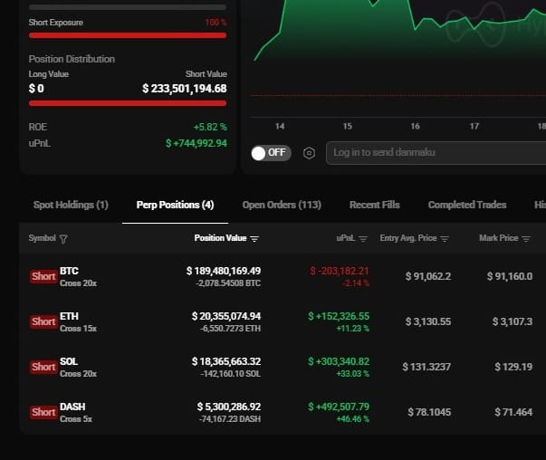 Z jednej strony niedźwiedzie machają ciężko. Adres znany jako kontrahent strategii, 0x94d3735543ecb3d339064151118644501c933814, zajmuje pozycję jako najwyższy krótki BTC Hyperliquida. Ten portfel kontroluje około 233 milionów dolarów w pozycjach, unosząc skromny zysk w wysokości 744 tys. dolarów na razie, podczas gdy jest krótki na 2,078 BTC, 6,550 ETH, 142,160 SOL i nawet 74,167 DASH. To nie jest handel, to światopogląd.