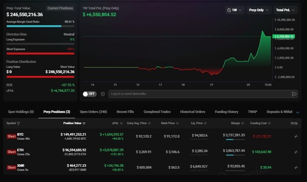 Tuż obok jest inny potwór, 0xd83516572789f1c782c8298efce58a5600318fd7. Ten zajmuje drugie miejsce w BTC short i trzecie w ETH short na platformie. Całkowita ekspozycja? Około 246 milionów dolarów. Niezrealizowany zysk wynosi blisko 6,7 miliona dolarów. Pozycje obejmują 1,640 BTC, 31,093 ETH i 823 XMR, wszystkie skierowane w dół. Po prostu pełne przekonanie, że rynek jeszcze nie przestał krwawić.