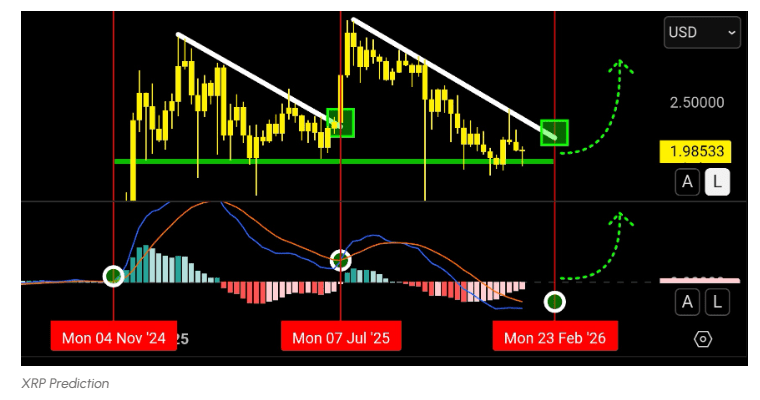 Zgodnie z ostatnim wykresem opracowanym przez ChartNerd, XRP wykazuje potencjał na bycze wybicie w nadchodzących tygodniach. Cena zbliża się do kluczowego poziomu, gdzie może przebić opadający opór, tworząc bycze przecięcie na tygodniowym MACD.