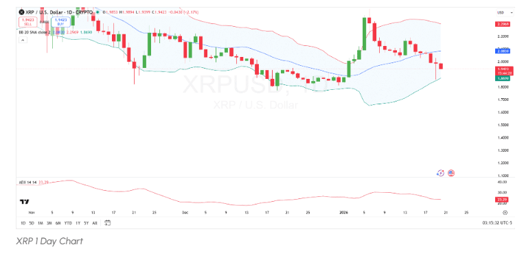 XRP obecnie handluje po $1.95, co oznacza spadek o około 0.3% w ciągu ostatnich 24 godzin. Ruch cenowy był stosunkowo negatywny w tym okresie, z dziennym zakresem między $1.94 a $2.02. 24-godzinny wolumen handlowy pozostaje znaczący na poziomie $2.84 miliardów; jednak wolumen spadł o 19.03%.