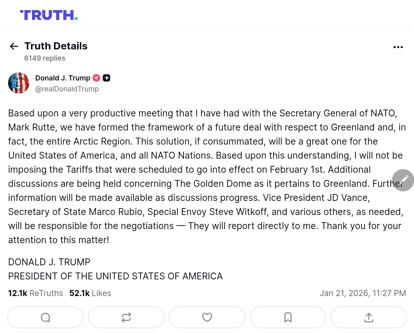 ❗На основе очень продуктивной встречи с Генеральным секретарем НАТО Марком Рютте мы сформировали основу для будущего соглашения в отношении Гренландии и, по сути, всего Арктического региона. Это решение, если оно будет реализовано, станет большим плюсом для Соединенных Штатов Америки и всех стран НАТО. Исходя из этого понимания, я не буду вводить тарифы, которые должны были вступить в силу 1 февраля. В настоящее время ведутся дополнительные обсуждения, касающиеся проекта «Золотой купол» в отношении Гренландии. Дополнительная информация будет предоставлена по мере продвижения обсуждений. Вице-президент Джей Ди Вэнс, государственный секретарь Марко Рубио, специальный посланник Стив Виткофф и другие лица, по мере необходимости, будут отвечать за переговоры — они будут отчитываться непосредственно передо мной. Благодарим вас за внимание к этому вопросу!