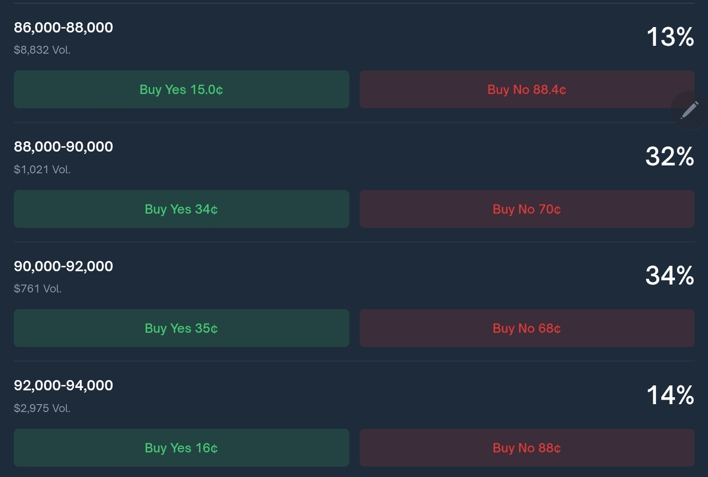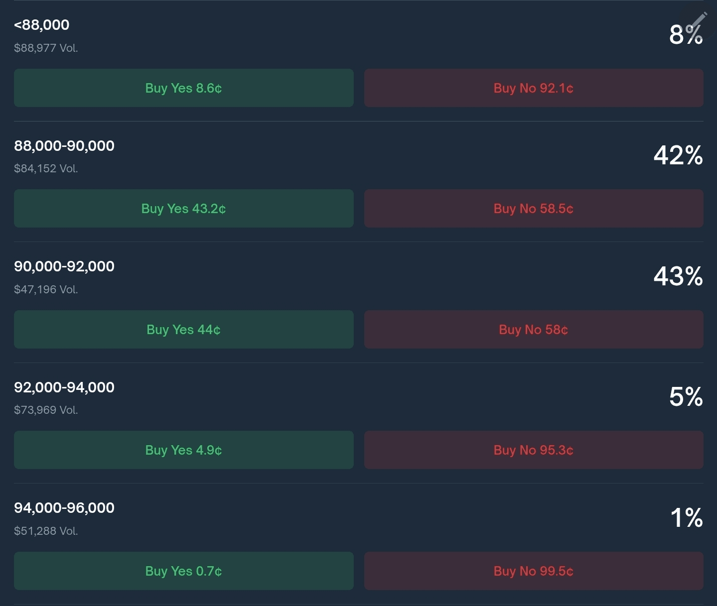 📍Прогноз большинства в Polymarket на сегодняшний и на завтрашний день даёт нам наиболее вероятный разброс цен 90-92k и практически равномершами 88-90k