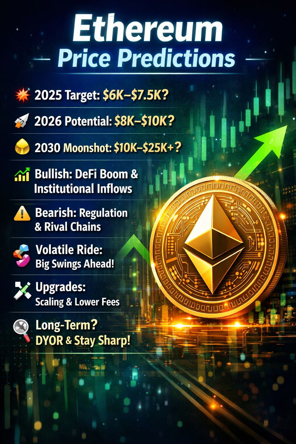 Krótko-terminowy (2025) — Wiele analizatorów oczekuje, że ETH wzrośnie powyżej obecnych poziomów, potencjalnie testując wcześniejsze maksima i zmierzając w kierunku ~$6,000–$7,500 do końca 2025 roku w korzystnych warunkach napędzanych przez adopcję, zyski ze stakowania i aktywność sieci. �
