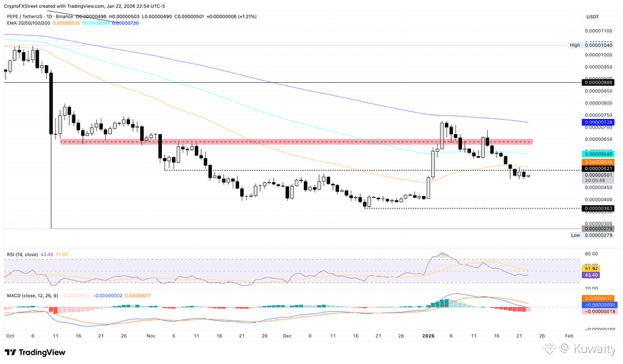 بيبي يواصل انخفاضه تحت المتوسط المتحرك الأسي لمدة 50 يومًا عند 0.00000535 دولار، مع خسارة تقارب 8% حتى الآن هذا الأسبوع. في وقت كتابة التقرير، لا يزال PEPE فوق المستوى النفسي 0.00000500 دولار يوم الجمعة، مما يعرضه لمزيد من الانخفاض بعد انخفاض بنسبة 4% في اليوم السابق.